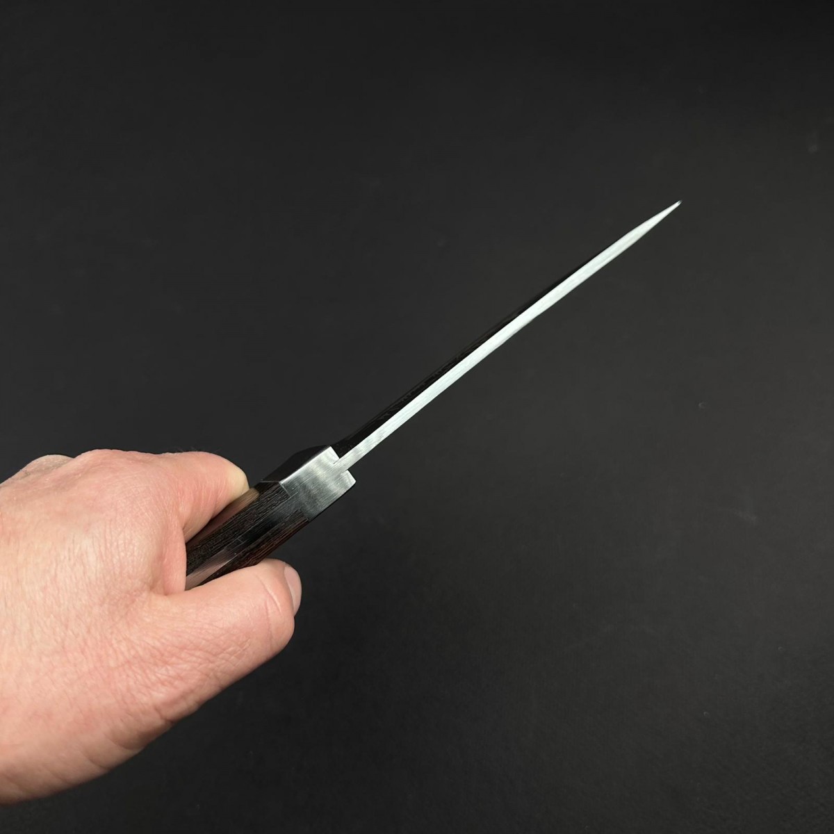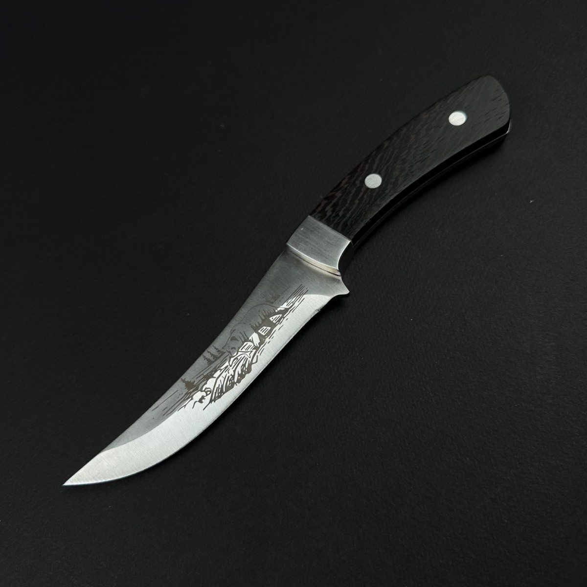 - Formă lamă: tip Skinner / drop-point curb, cu curbă pronunțată pentru jupuire și tăiere controlată, vârf fin pentru precizie