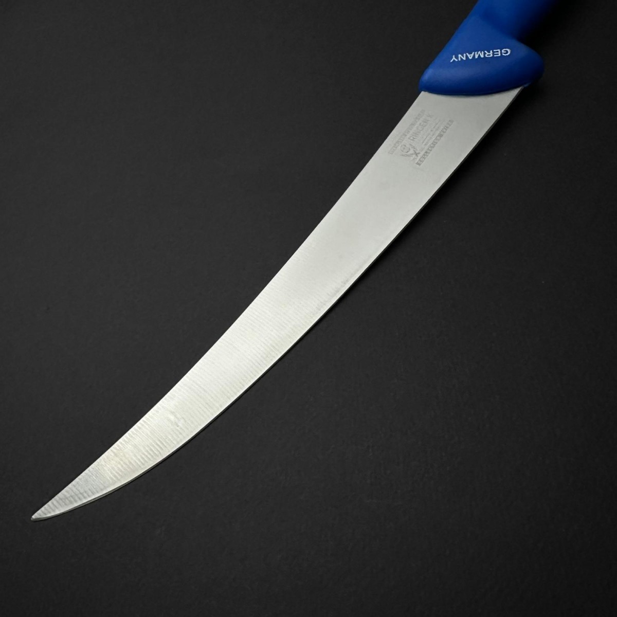 Un cuțit specializat și precis – combinația de lamă îngustă din otel inox cu vârf ascuțit și mâner albastru aderent îl face un tool de încredere pentru dezosare profesională și lucrări fine cu carne crudă.