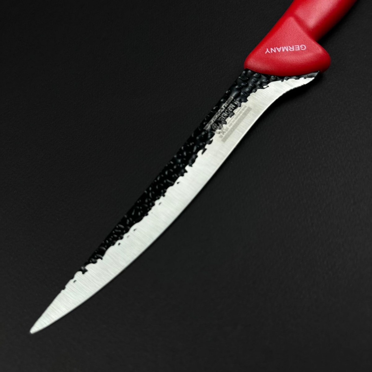 Cuțit măcelărie profesional tip înjunghiat, conceput special pentru tranșare precisă, dezosare și lucrări fine în bucătărie sau activități de măcelărie. Lama lungă de 18 cm cu vârf ascutit ce permite penetrare ușoară și tăiere controlată, fiind ideal pentru separarea cărnii de oase, tăiere precisă în jurul articulațiilor sau lucrări delicate pe carne crudă. Aspectul robust și premium vine de la finisajul texturat al lamei din fier forjat și mânerul ergonomic din ABS roșu intens, rezistent la umezeală, grăsimi și alunecare.