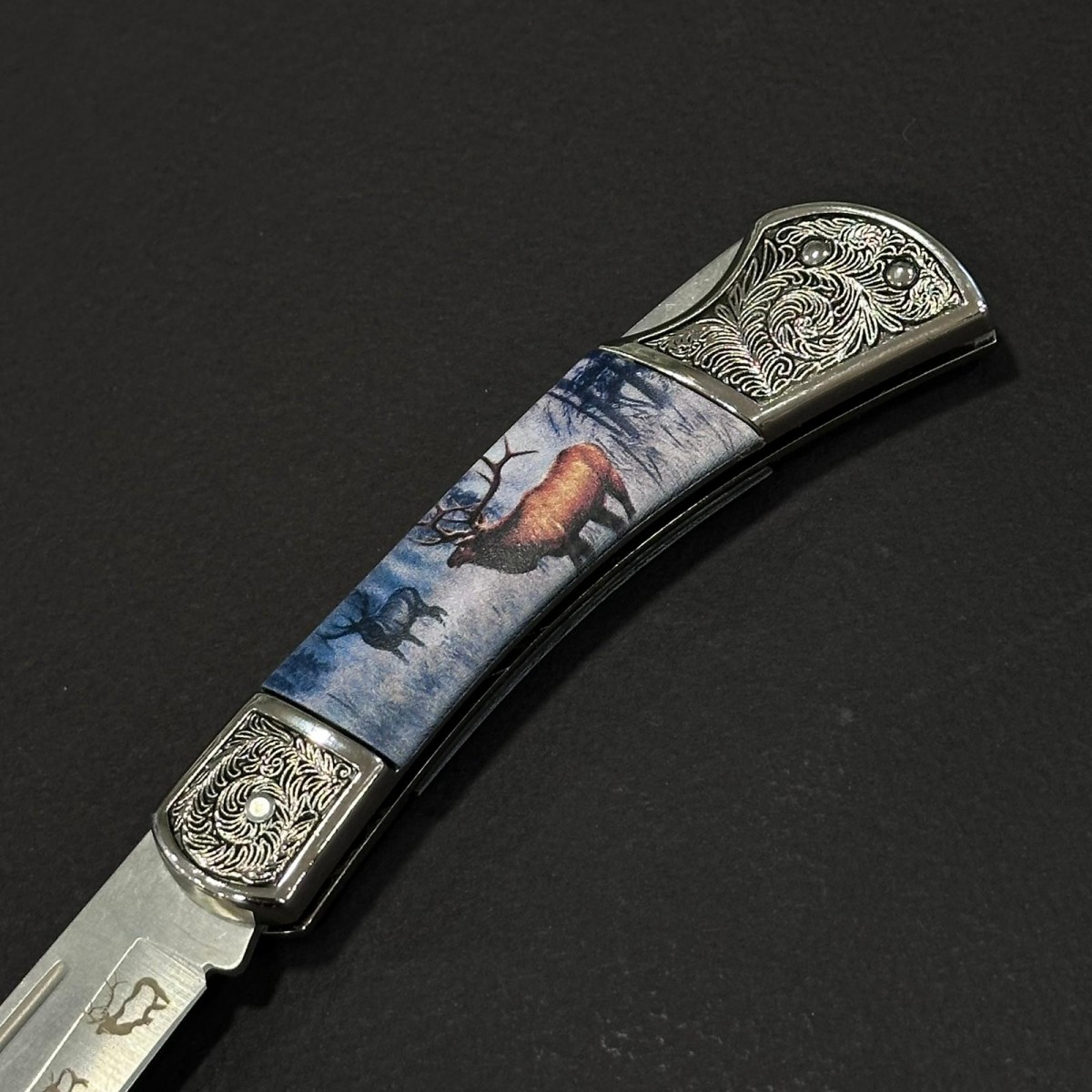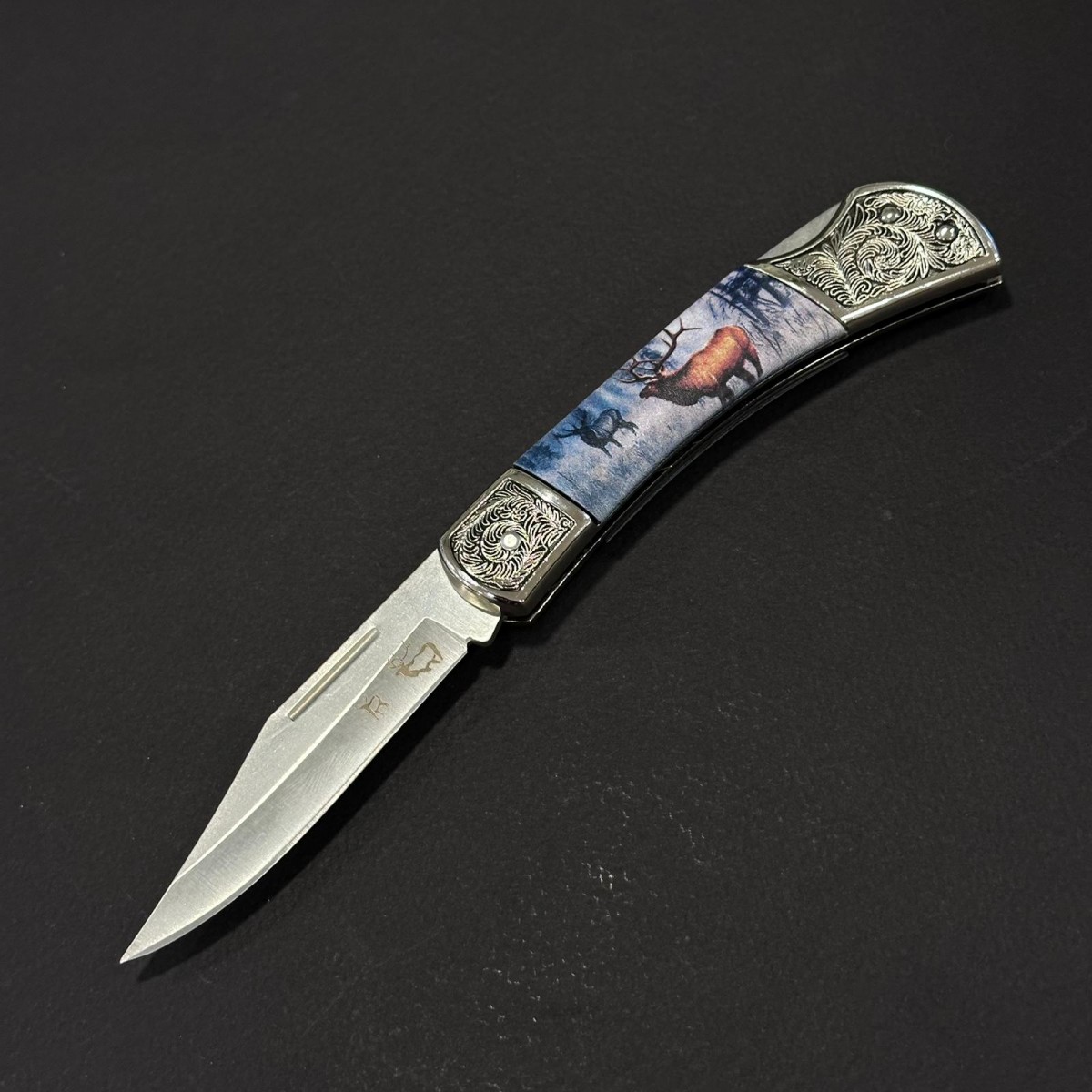 Briceag camping Anima 19 cm, lamă oțel inoxidabil, mâner cu imprimeu tematică vânătoare.