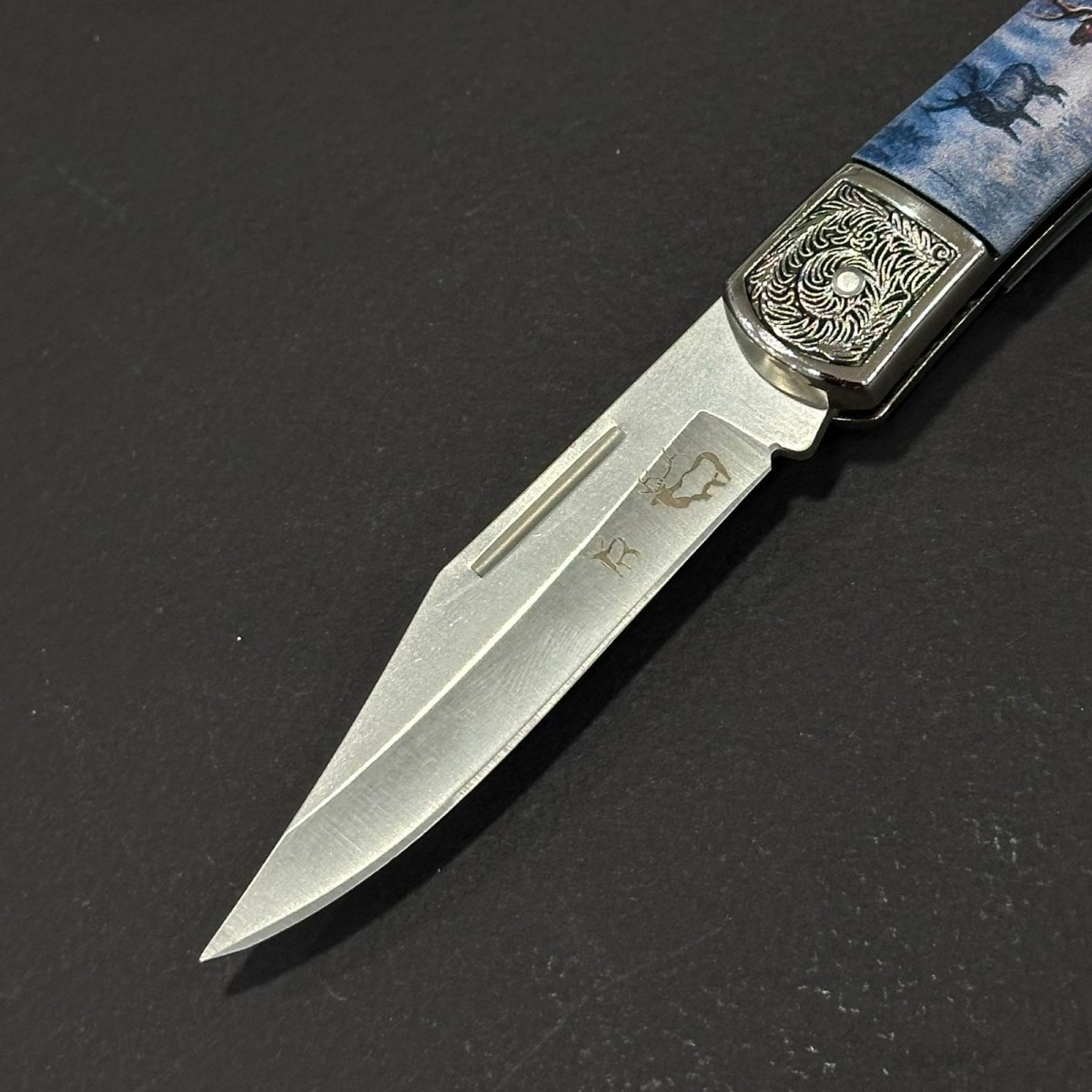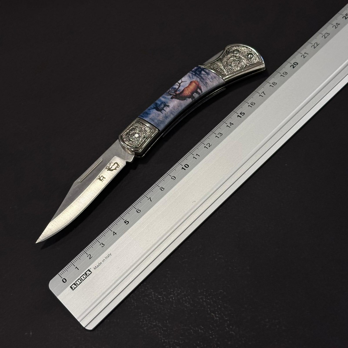 Briceag compact și agresiv Anima, conceput pentru camping, bushcraft, vânătoare ușoară, drumeții sau EDC tactic. Lama din oțel inoxidabil oferă ascuțime excelentă și rezistență la rugină, cu profil drop-point ascuțit și curbă ușoară pentru tăiere precisă, penetrare și control în task-uri fine sau grosiere. Mânerul ergonomic texturat cu inserție artistică tematică vânătoare oferă priză sigură și aspect premium, deosebit. Finisaj metalic lucios pe gardă și capăt pomel, pliabil cu blocare sigură – un companion stilat, puternic și funcțional pentru orice aventură în natură.