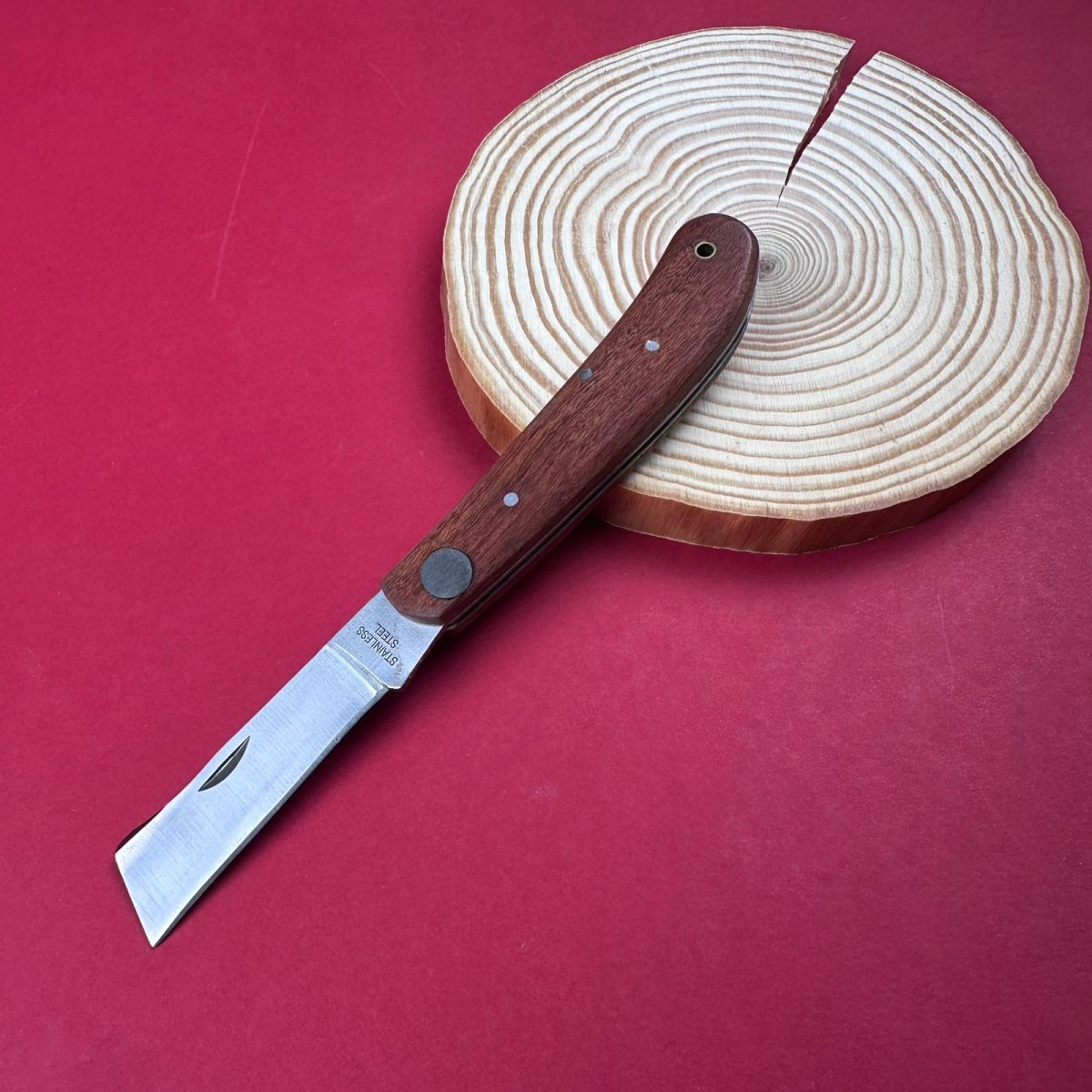 Cuțit pliabil pentru altoit cu lamă curbă tip cioc – lamă 6 cm inox, mâner lemn visiniu, total desch..