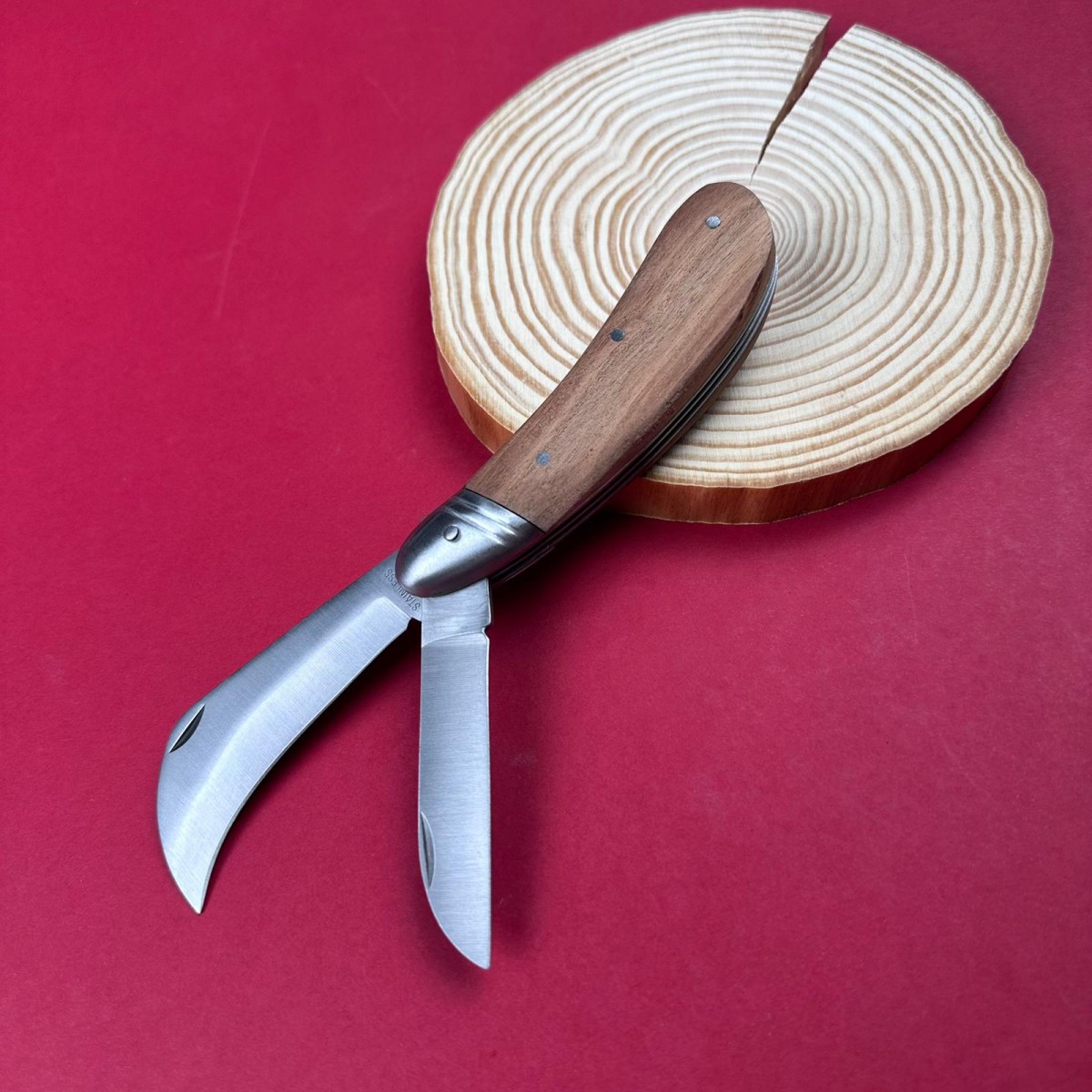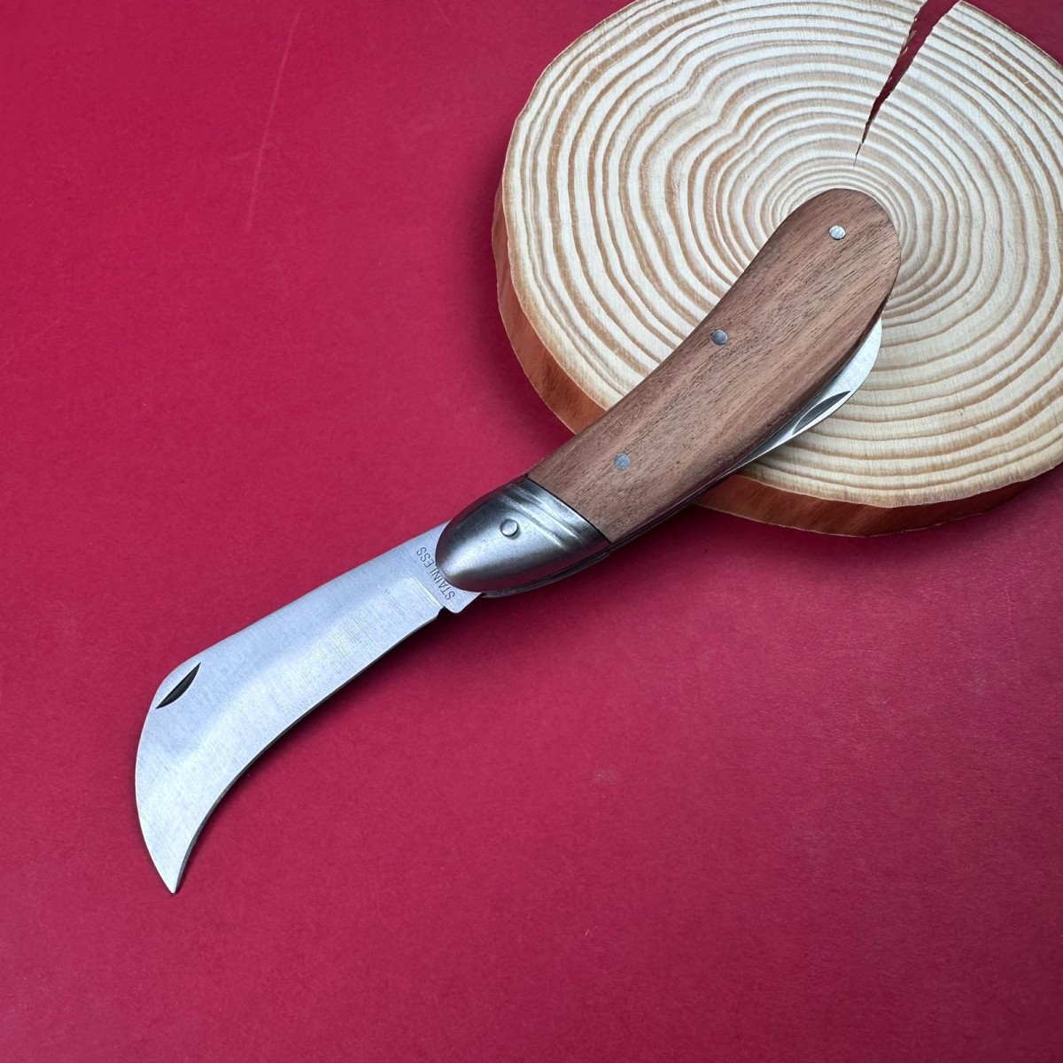 Cuțit pliabil pentru altoit cu lamă curbă tip cioc – lamă 7 cm inox, mâner lemn maro, total deschis ..