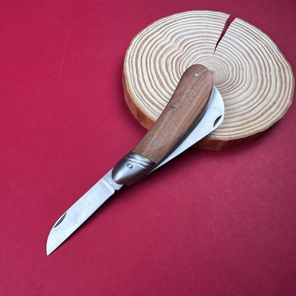 Cuțit pliabil pentru altoit și camping – lamă 6.5 cm inox curbă, mâner lemn maro, total deschis 19 c..