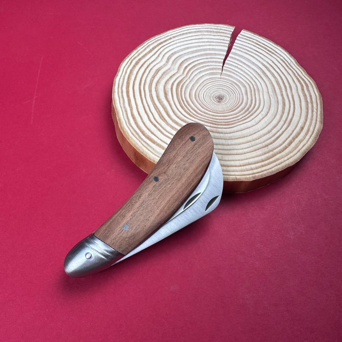Cuțit pliabil pentru altoit cu lamă curbă tip cioc – lamă 6 cm inox, mâner lemn visiniu, total desch..