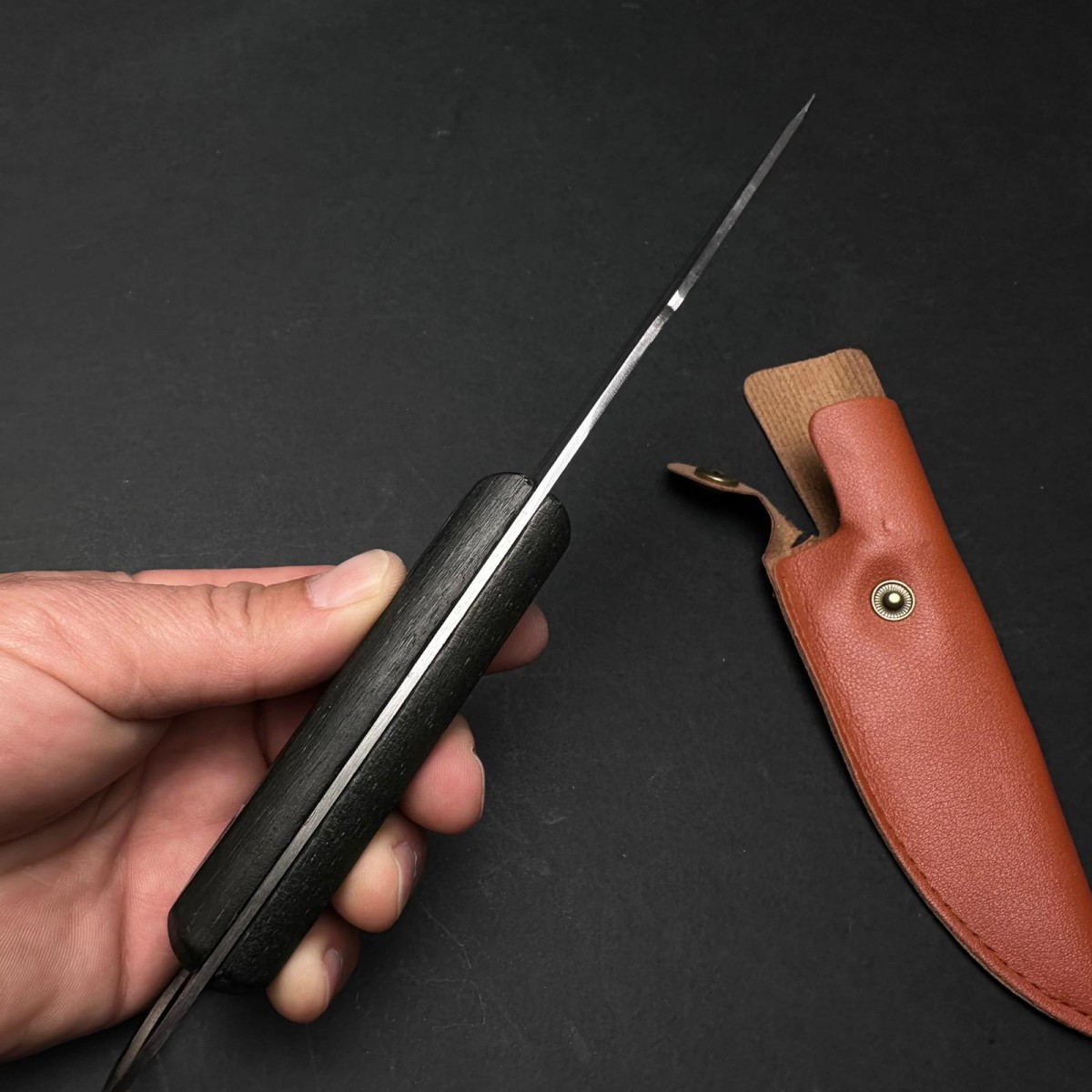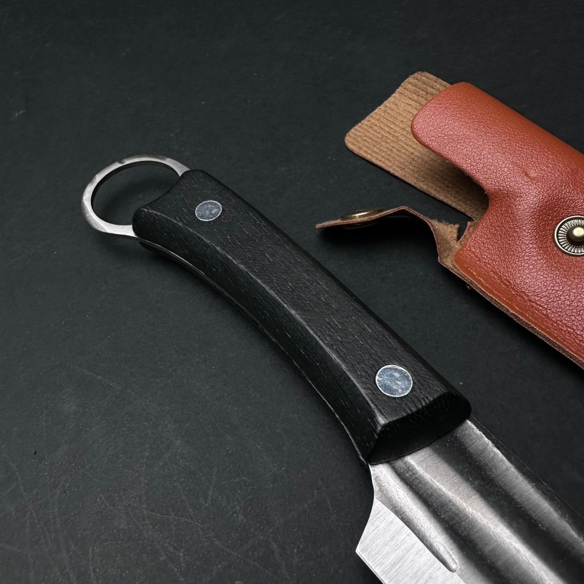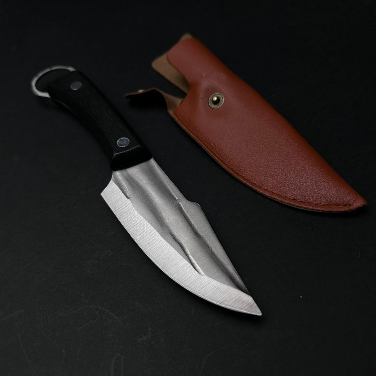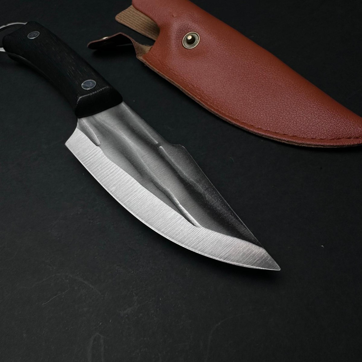 Cuțit Camping și Drumeție 23cm – Lamă din Oțel Inoxidabil, Mâner din Lemn Negru si Agatatoare, cu Teacă de Protecție.