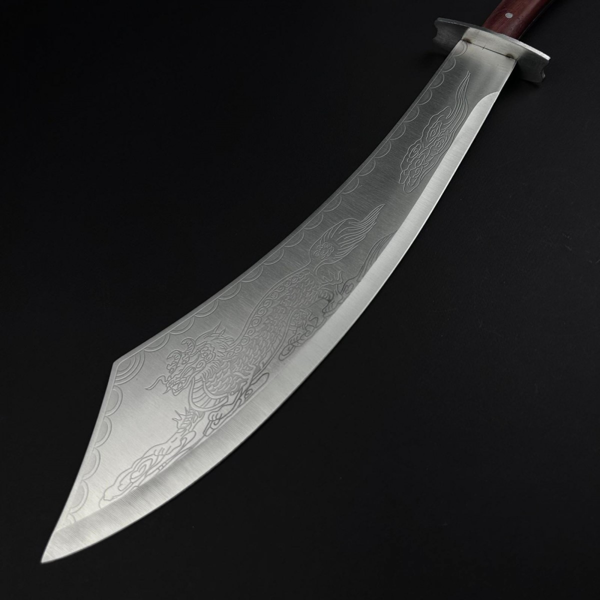 Macetă / cuțit fix extrem de lung și impresionant, cu design tip Bowie / macetă supraviețuire, ideal pentru camping extrem, bushcraft avansat, supraviețuire în natură, clearing teren dens, pregătire lemne mari sau vânătoare grea. Lama masivă de 44 cm este gravată artistic manual (motiv tematic cu dragon și nori / valuri), oferind un aspect unic, premium și colecționabil. Muchia zimțată parțial permite și ferăstrău eficient pentru ramuri sau sfoară groasă. Aspectul rustic-premium vine de la finisajul satinat al lamei inox, mânerul ergonomic din lemn maro cu nituri metalice și teaca textilă rezistentă cu prindere la centură sau rucsac.