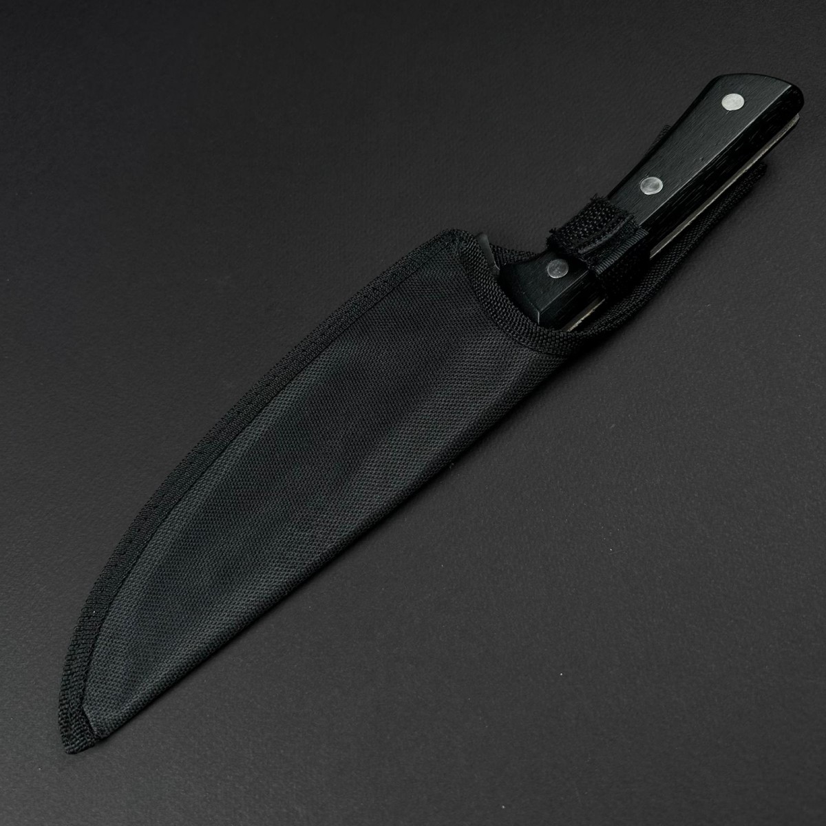 1buc. Cutit camping japonez 29cm, lama 19cm fier forjat, teaca textil, maner lemn negru