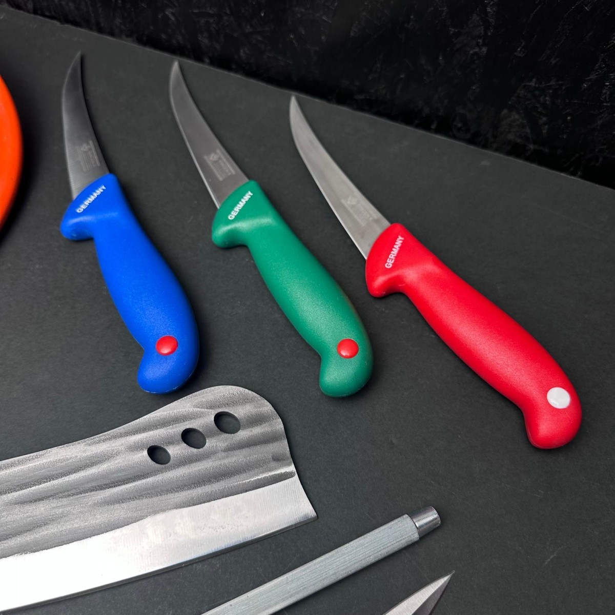 Setul contine:1buc. Cutit macelarie transat 26cm, lama 12cm otel inox, maner rosu1buc. Cutit macelar..