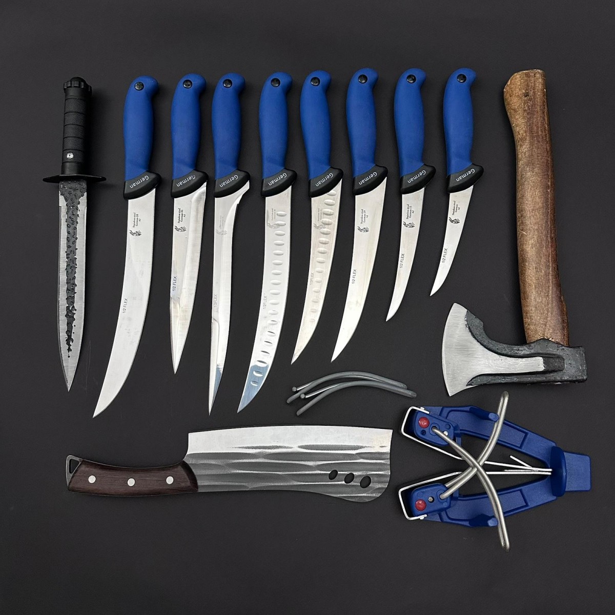 Set macelarie maner silicon SLNA 12 piese, Toporisca 34cm, Satar 33cm, Cutit fier forjat si 8 cutite otel inox + Dispozitiv ascutit, albastru
