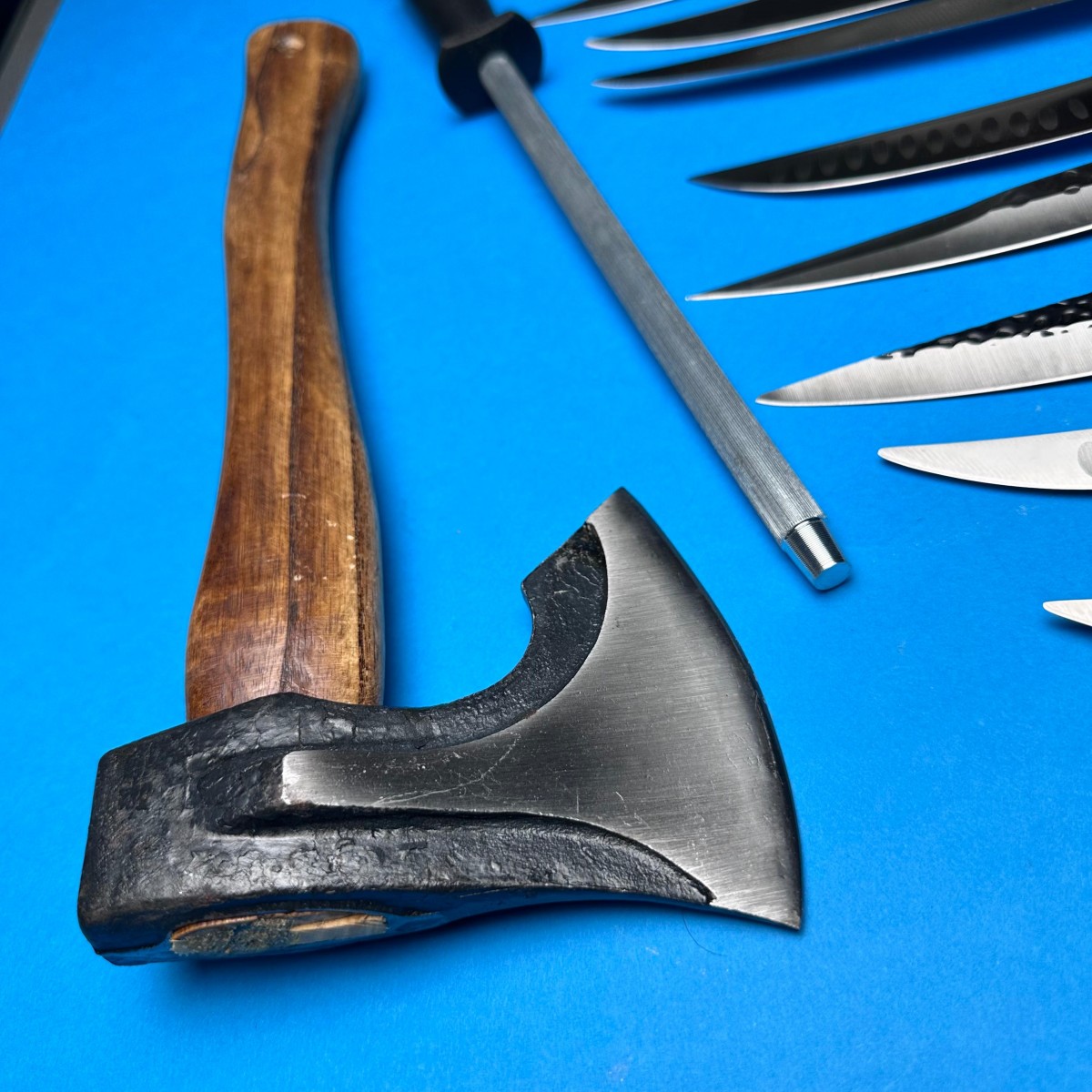 Set Măcelărie 13 Piese – Toporișcă, 4 Cuțite Fier Forjat, 7 Cuțite Oțel Inoxidabil + Pilă Ascuțit, Albastru.