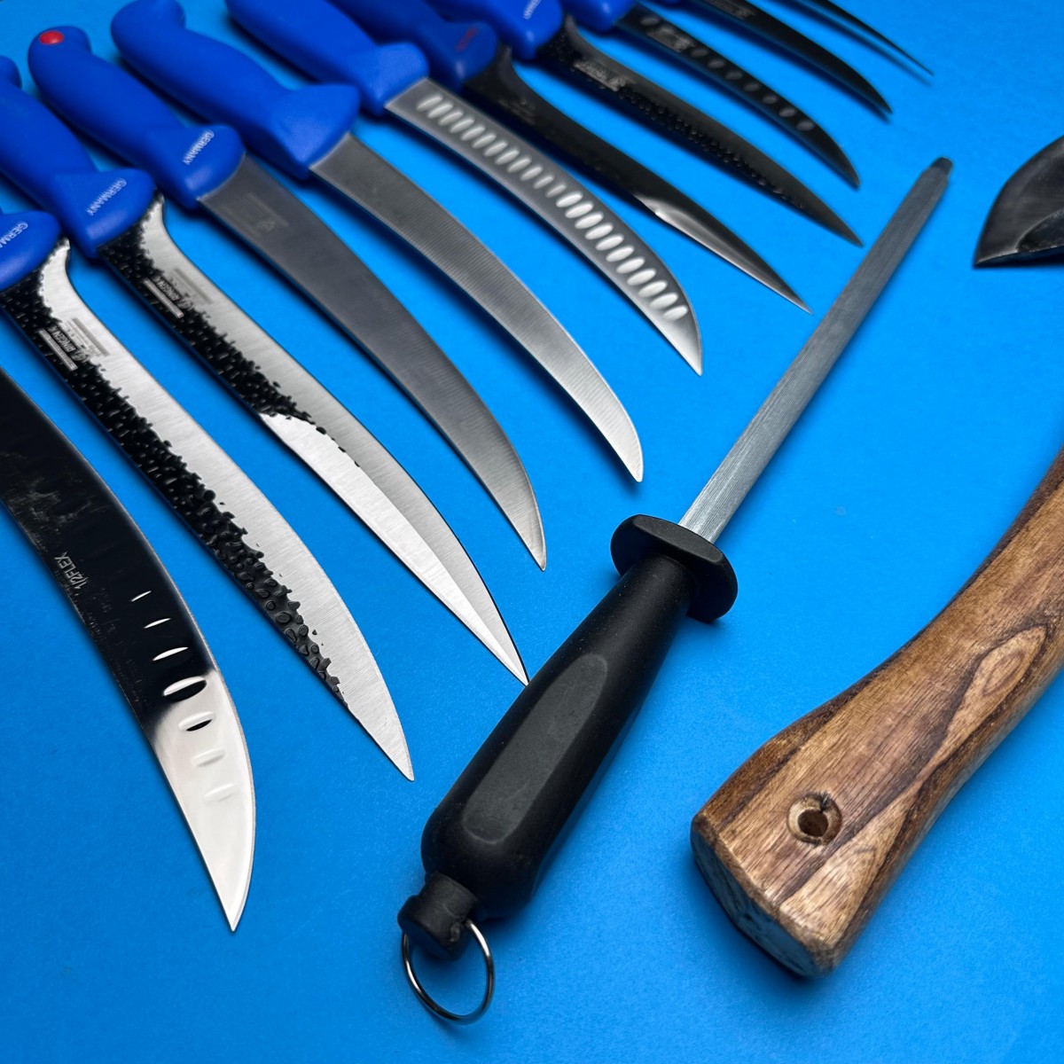 Set macelarie 13 piese, Toporisca, 4 cutite fier forjat, 7 cutite inox + pila ascutit, albastru MPAB